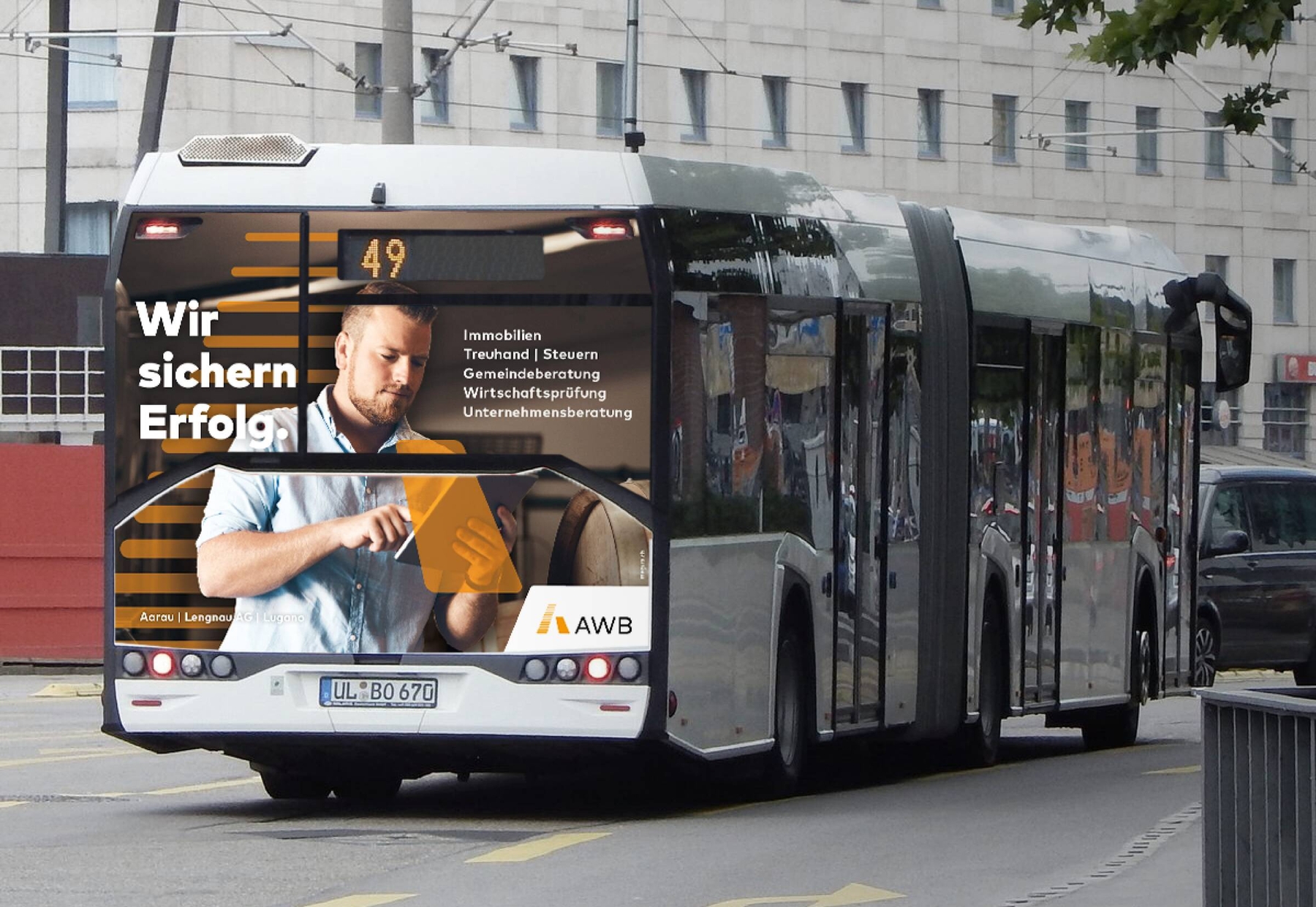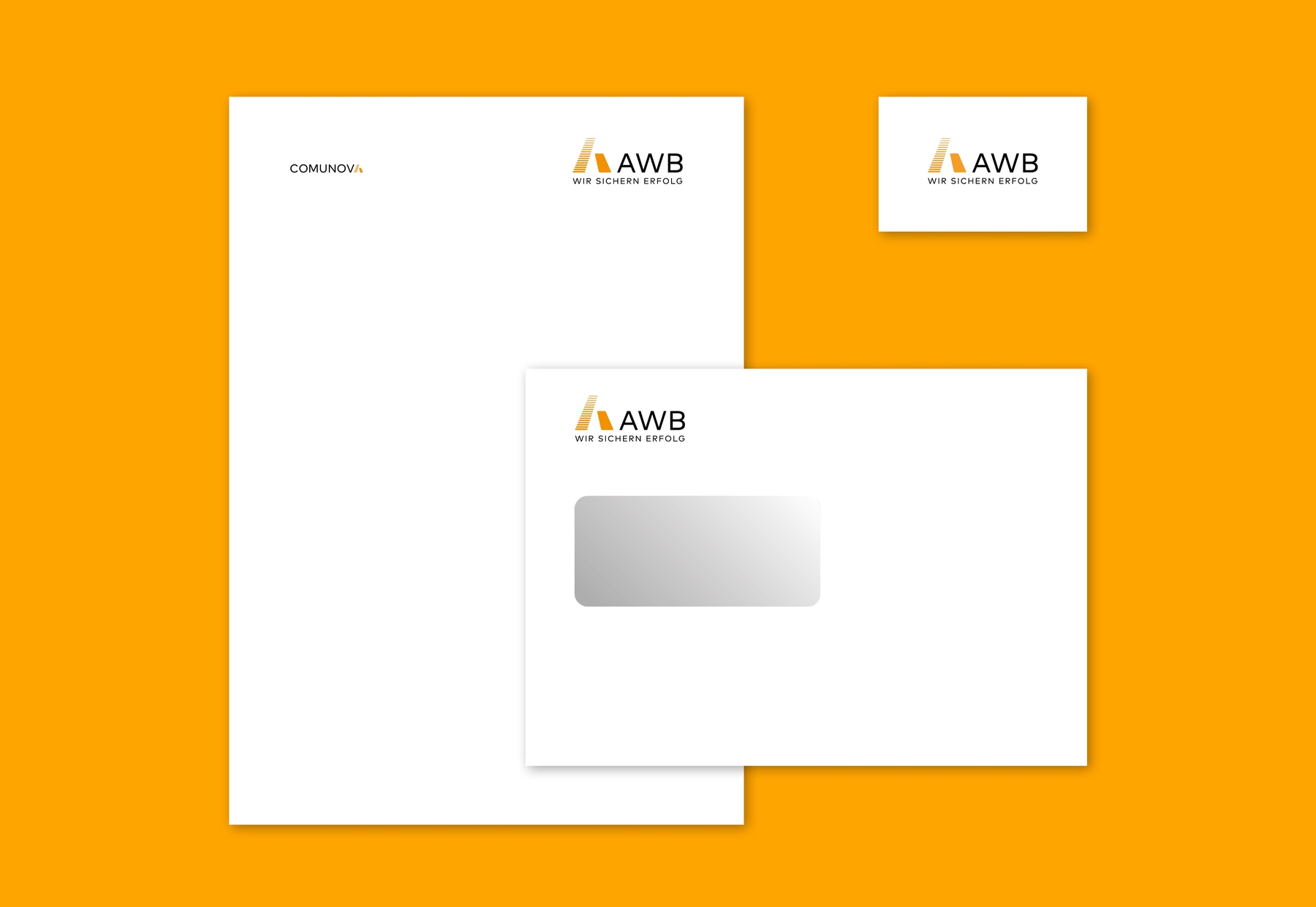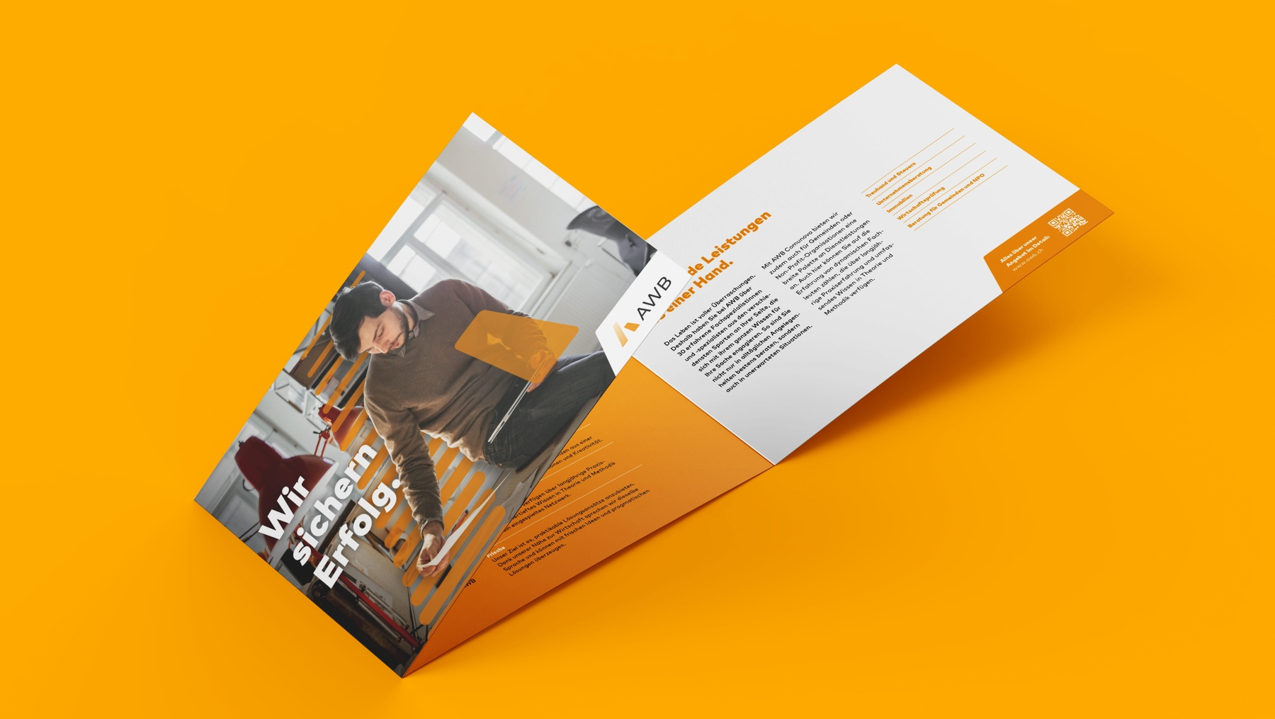 In einem Workshop mit den verschiedenen Geschäftsleitungsmitgliedern wurde nach dem gemeinsamen Nenner für die Firma gesucht. Das Resultat des mehrstufigen Prozesses: «Wir sichern Erfolg» – eine plakative Single-Message als Markenclaim und Ausgangspunkt für die Entwicklung von CI/CD, Bildwelt und Tonalität. In der Konsequenz entstand das orange A, das als plakatives Gestaltungselement in den Bildern das Gefühl von Sicherheit im Arbeitsalltag der AWB-Kunden illustriert.