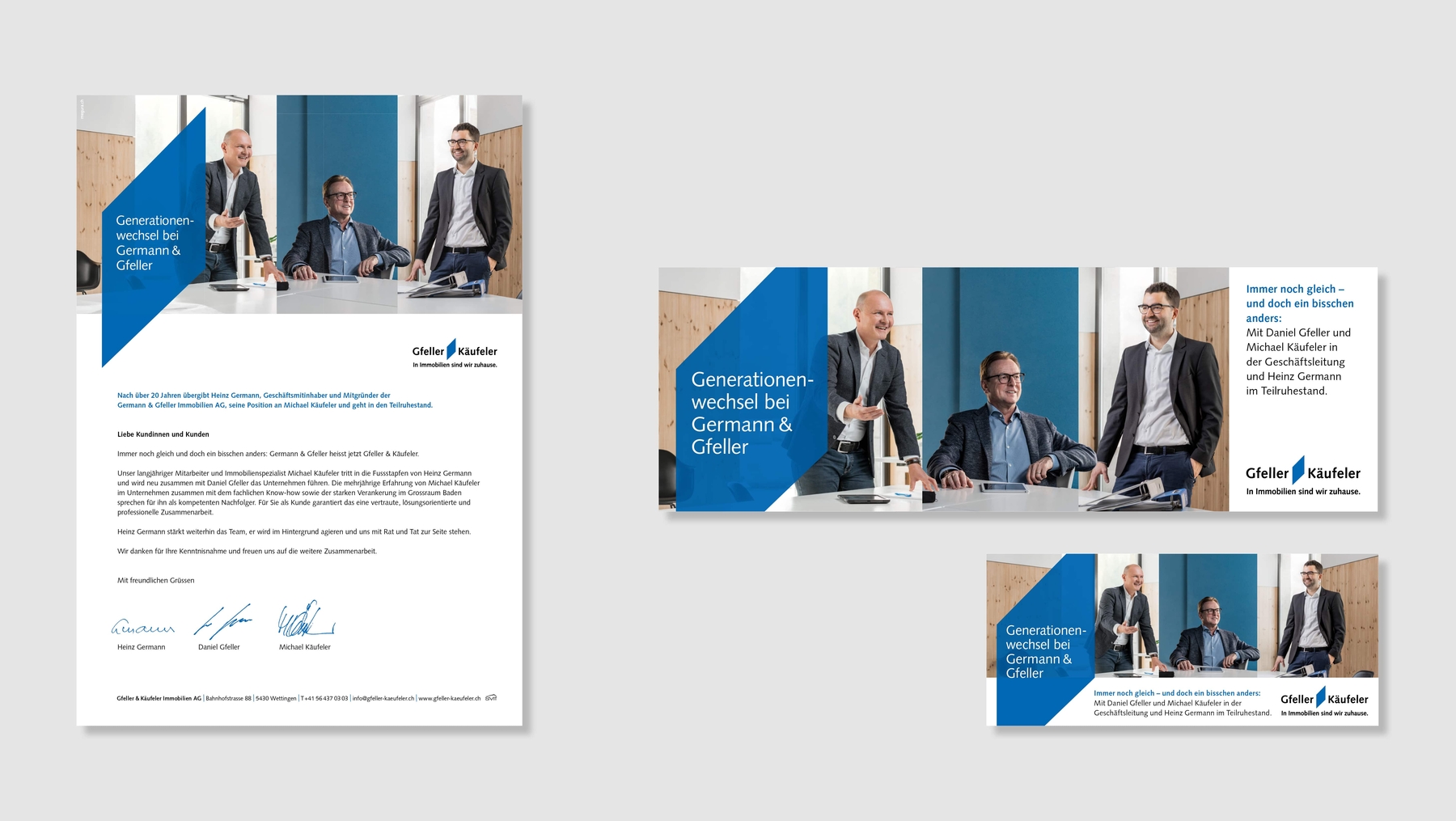Um das Renaming von Gfeller & Käufeler breit zu kommunizieren, gab es verschiedene Kommunikationsmassnahmen. Vom Plakat über Mailing, bis hin zu Inseraten und Werbebanner. Zusätzlich zu den analogen Medien wurde der digitale Auftritt aufgefrischt.
