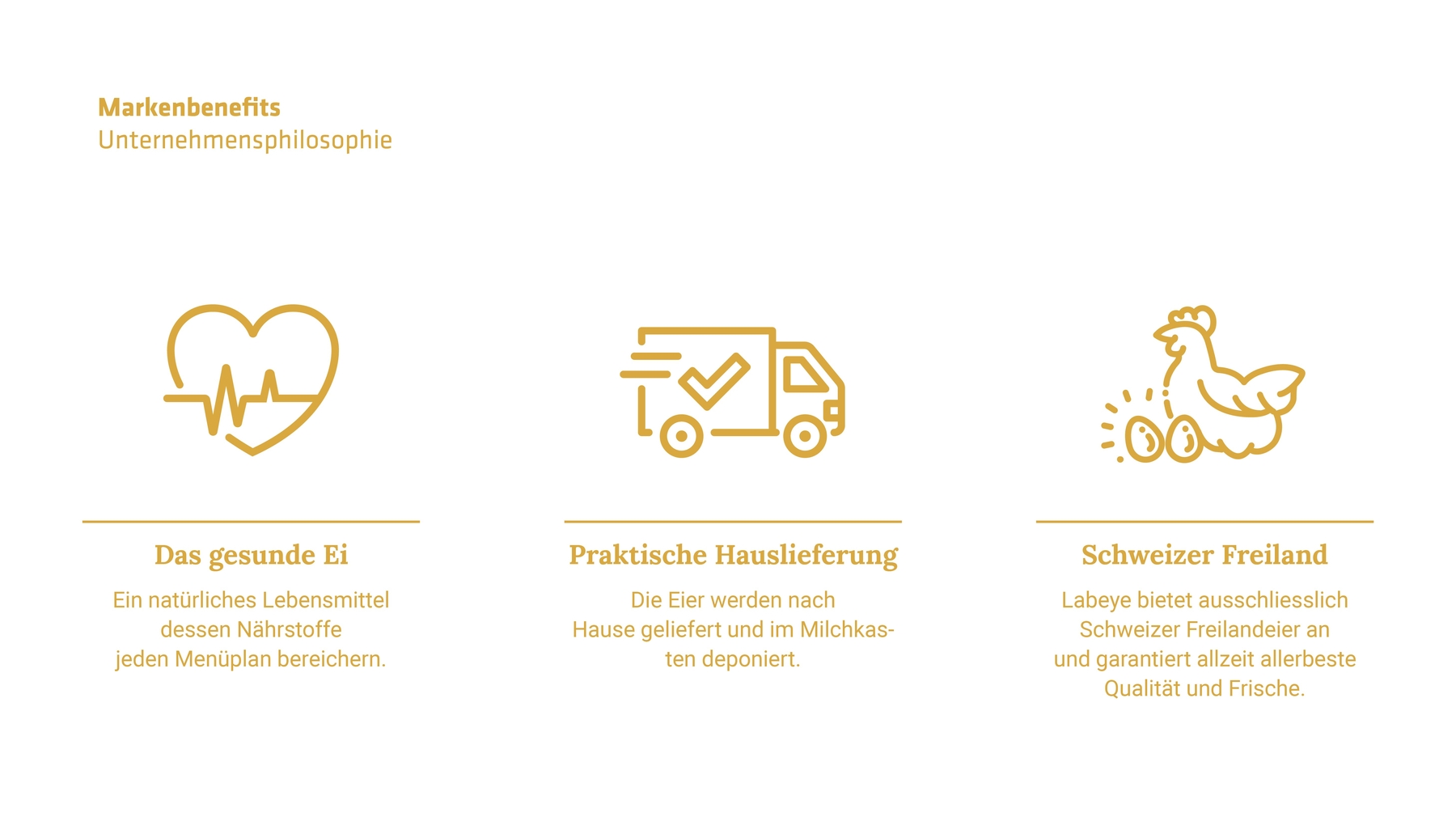 Ein bodenständiges und aussagekräftiges Markenversprechen. Die Aspekte Nachhaltigkeit und tierfreundliche Hühnerhaltung werden zentral mit Labeye’s Schweizer Qualitätsversprechen verbunden.