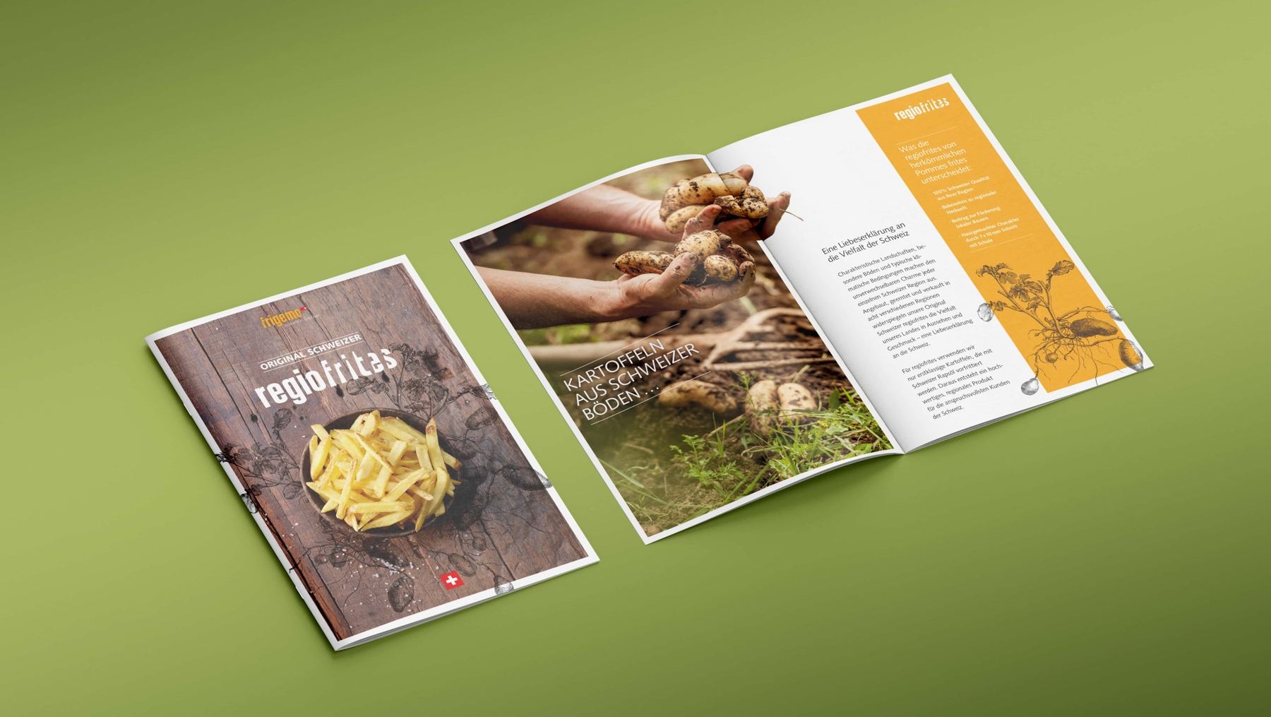 Von der Landingpage über die Imagebroschüre bis zum Buntstift: Design und Inhalte sprechen in einer urchigen und schweizerischen Tonalität. Ein neuer Farbcode für die Pommes-Sorten von frigemo schafft Übersichtlichkeit.