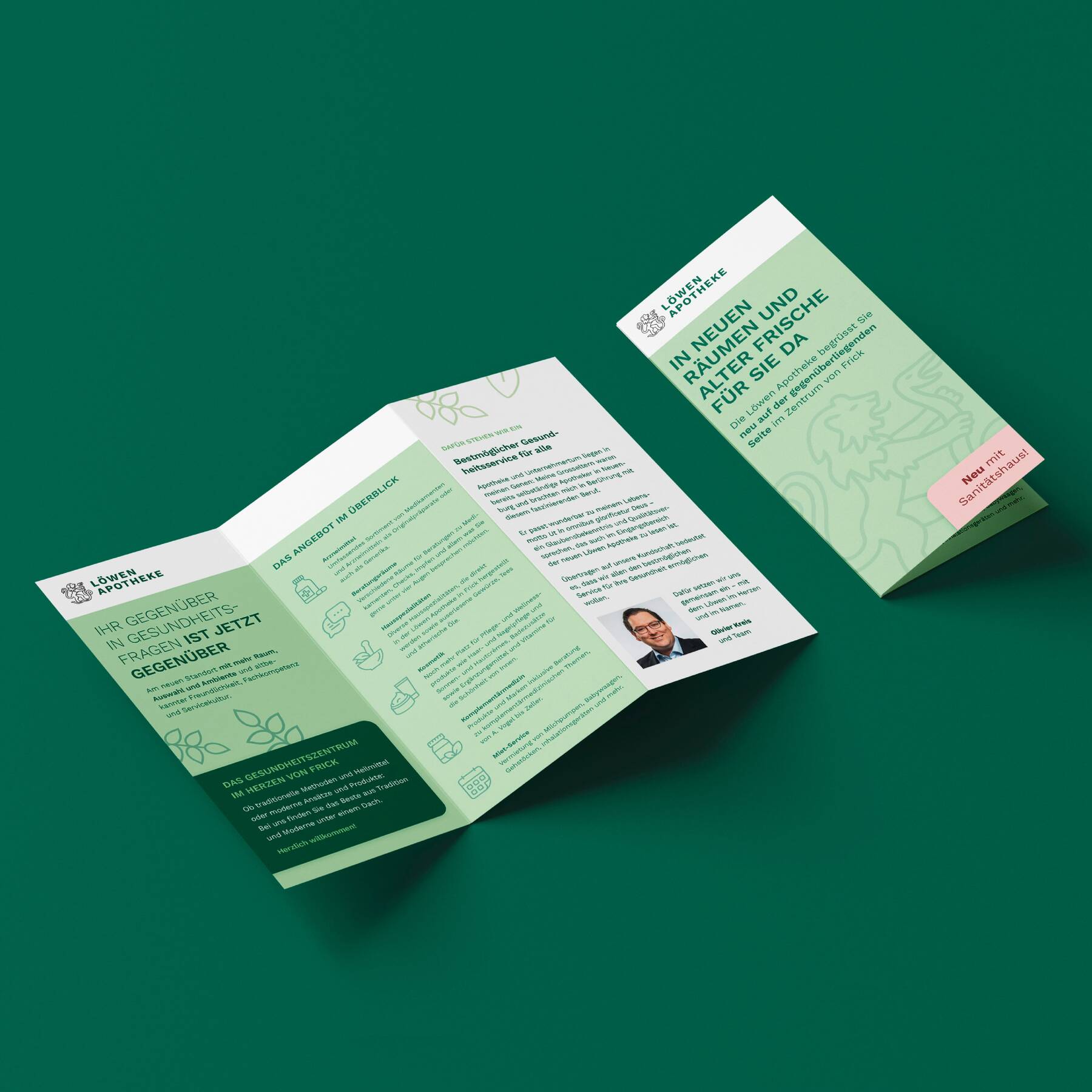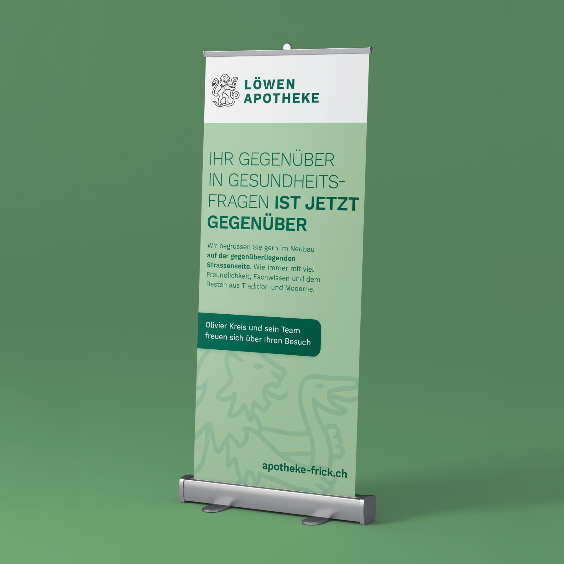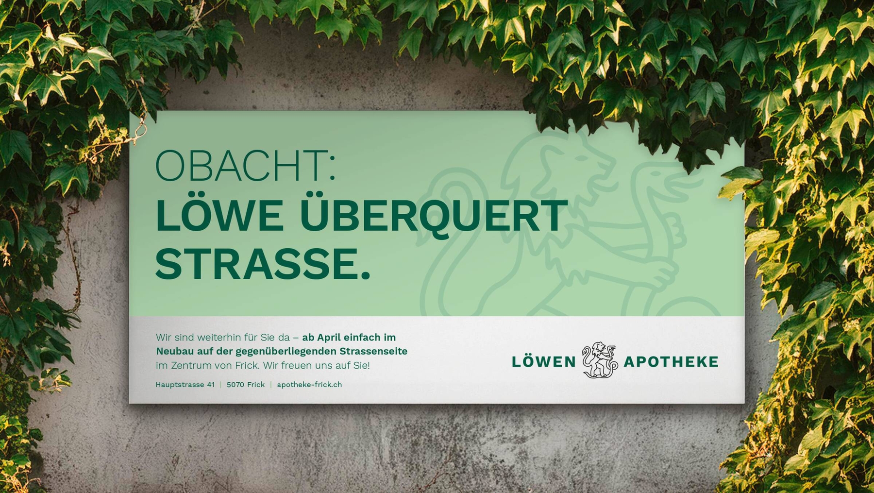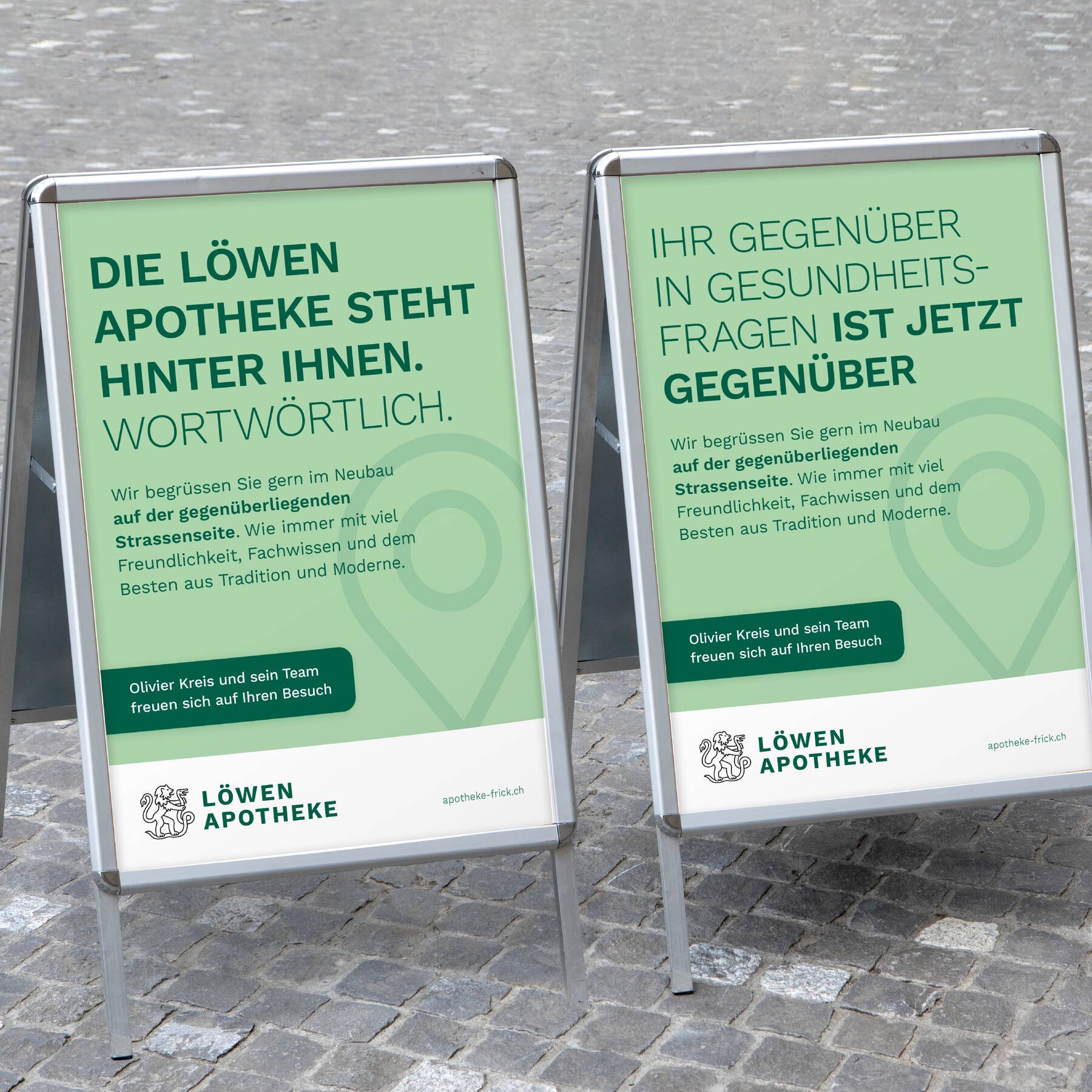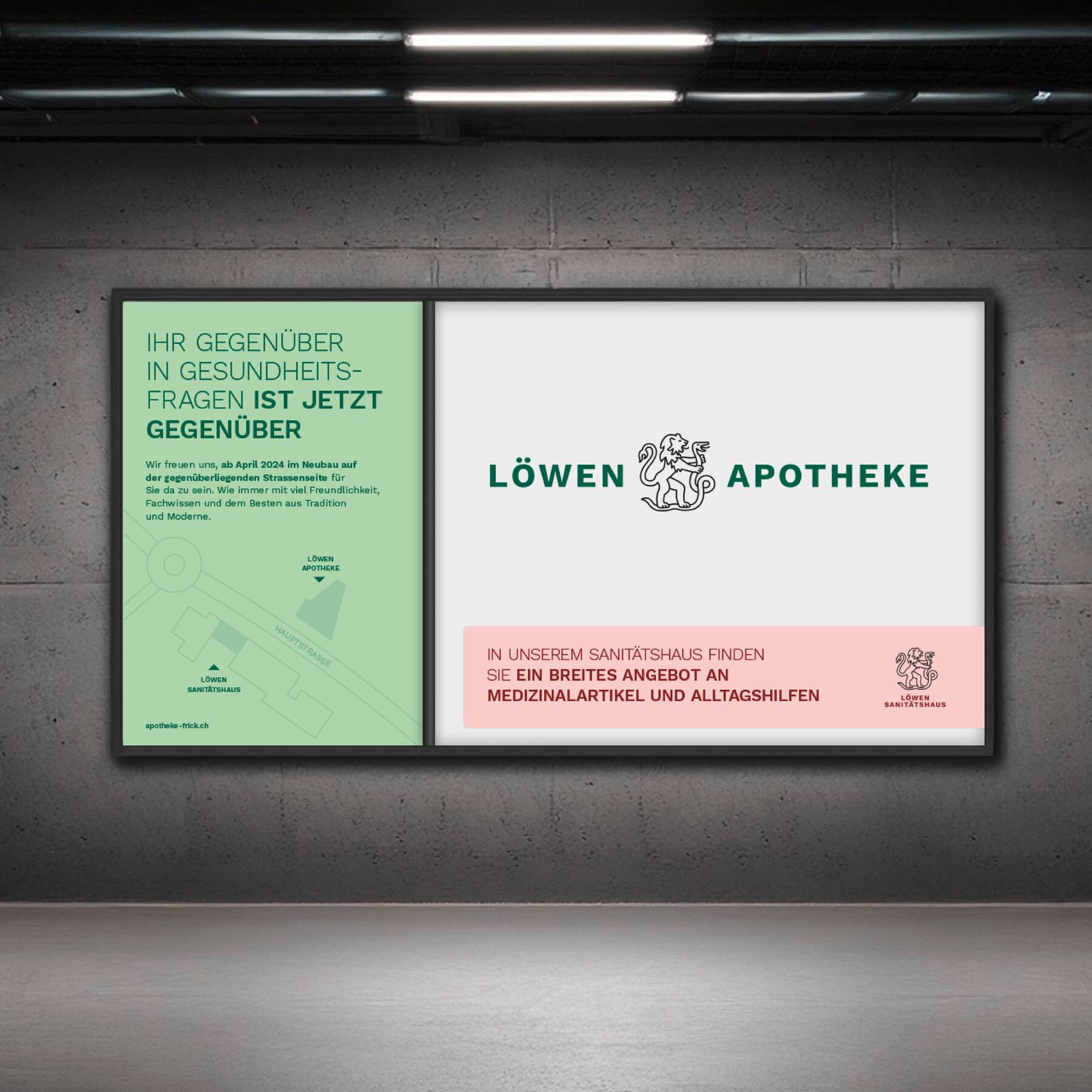Die Löwen-Apotheke ist seit 1946 ein kompetentes Gegenüber in der Region Frick. Mit dem Umzug auf die andere Strassenseite liegt sie nun tatsächlich gegenüber – in einem Neubau mit mehr Raum für ihre Produkte, Services und Beratungen. Zudem eröffnet sie in den alten Räumen das neue Löwen Sanitätshaus.