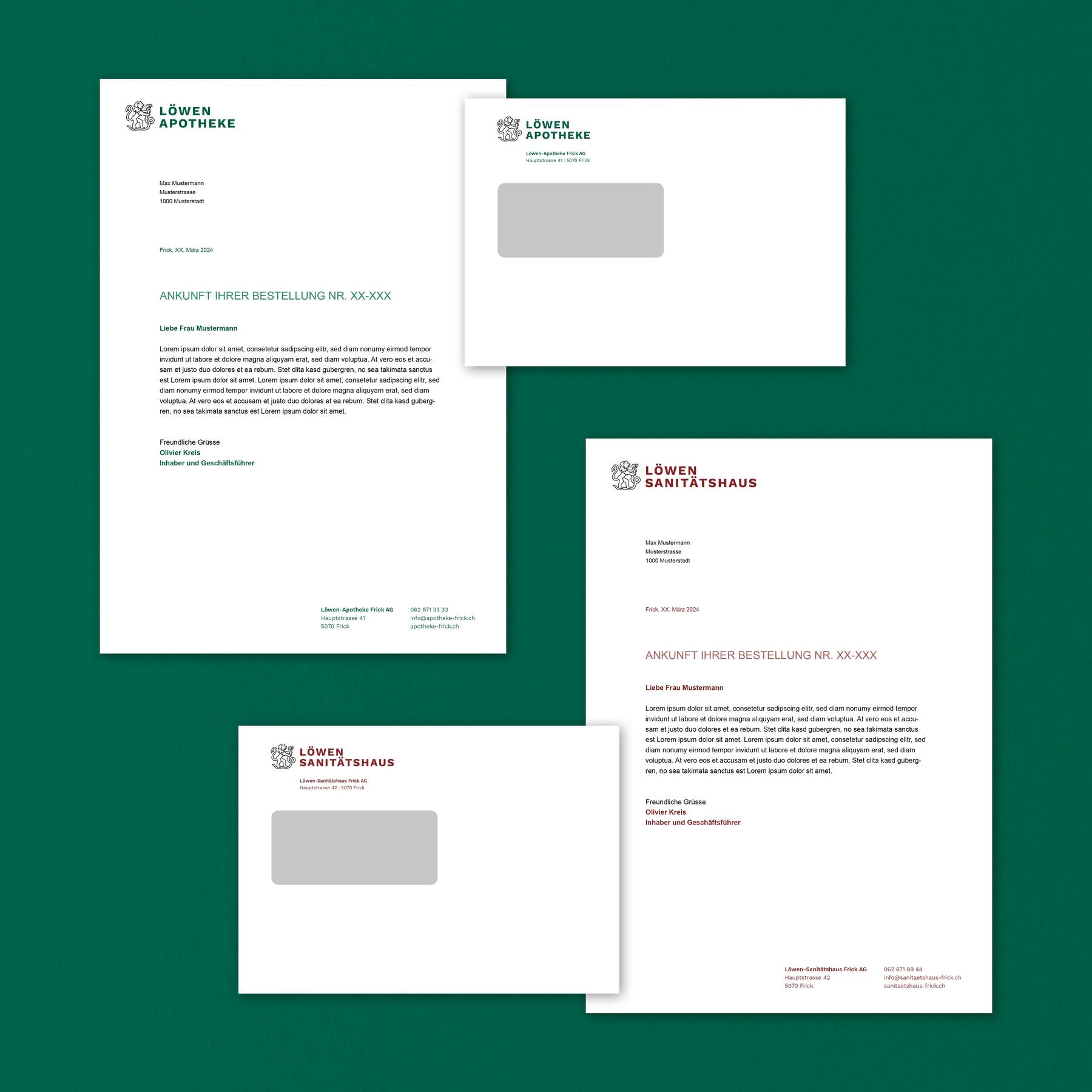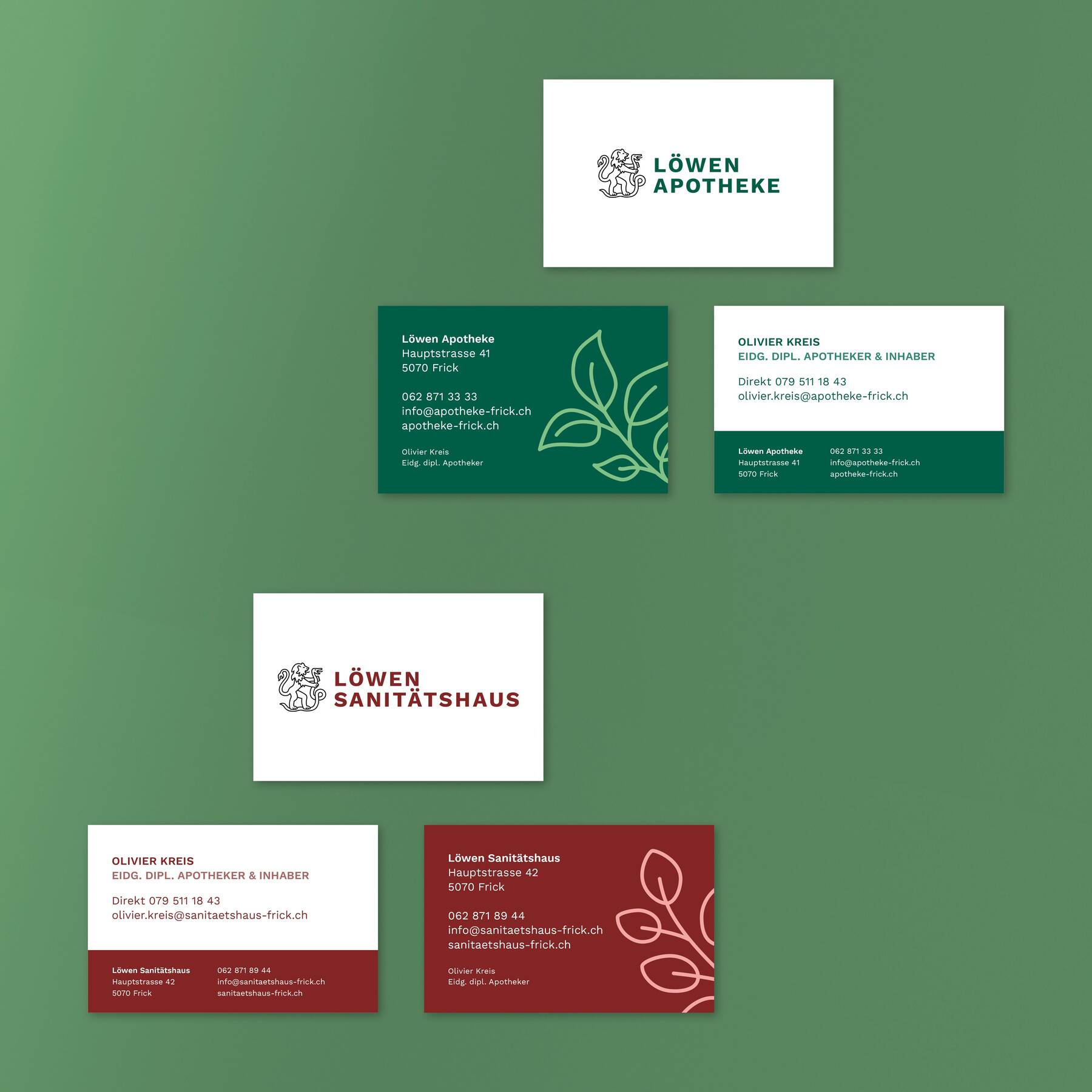 Auf der einen Seite wurde der ursprüngliche Löwe im Logo wiederbelebt – und damit die traditionelle Seite der alteingesessenen Apotheke. Auf der anderen Seite wurden Typografie und Grafik modernisiert, um die moderne und frische Seite der Apotheke spürbar werden zu lassen. Zusammen mit illustrativen Elementen und diversen Sekundärfarben entstand so ein Konzept, das alle möglichen Anwendungen ermöglicht: Webseite, Kommunikation, Produktdesign – grün für die Apotheke, rot für das Sanitätshaus.