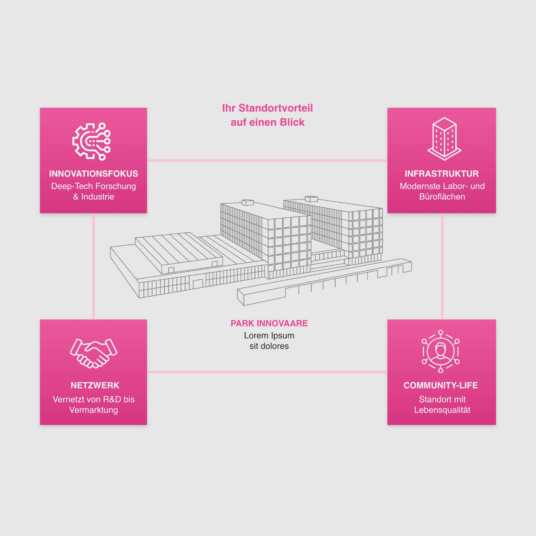 Der Park Innovaare verfügt nicht nur über einen Beschleuniger in unmittelbarer Nähe, er fungiert selbst auch als Beschleuniger bei Innovationsprojekten – dank klarem Themenfokus, entsprechender Infrastruktur, Netzwerk und Community Life. Diese Kernaussage wurde in seinen verschiedenen Facetten und innerhalb des bestehenden Corporate Designs inszeniert.